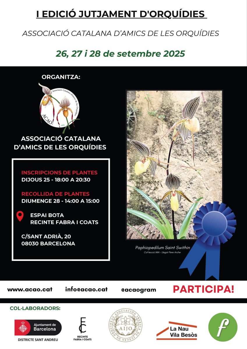La Associació Catalana d’Amics de les Orquídies organiza el 27 de septiembre en Barcelona el primer Certamen de Orquídeas de España con juzgamiento oficial conforme a los estándares del Consejo Europeo de la Orquídea. El evento marca un hito en el país al ser la primera competición que cumple los criterios internacionales para la valoración y premiación de estas plantas.