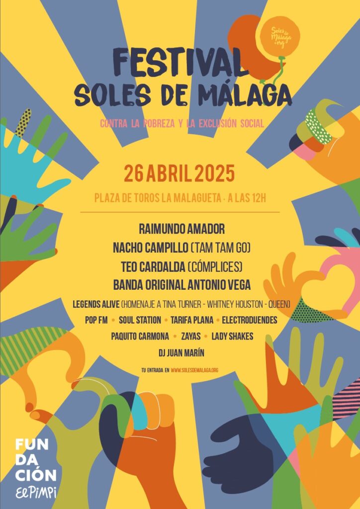 La Plaza de Toros de la Malagueta acogerá el 26 de abril la sexta edición del Festival Solidario Soles de Málaga, organizado por la Fundación El Pimpi, que contará con artistas como Raimundo Amador, Nacho Campillo de Tam Tam Go!, Teo Cardalda de Cómplices y la banda original de Antonio Vega durante 12 horas ininterrumpidas de música, presentadas por Belinda Washington y Manolo Sarria.