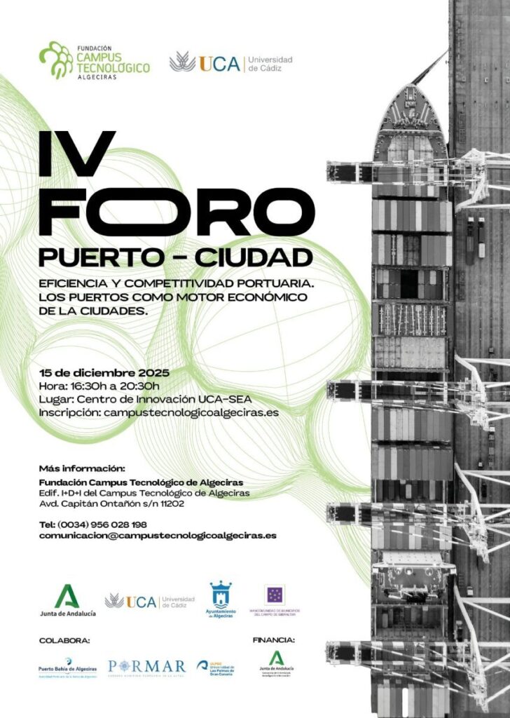 El Centro de Innovación UCA-SEA acogerá el 15 de diciembre el IV Foro Puerto-Ciudad, centrado en la eficiencia y competitividad portuaria y organizado por la Fundación Campus Tecnológico de Algeciras y la Universidad de Cádiz. El foro analizará los principales factores que condicionan la competitividad de los puertos en un contexto marcado por las políticas de descarbonización del sector marítimo portuario.