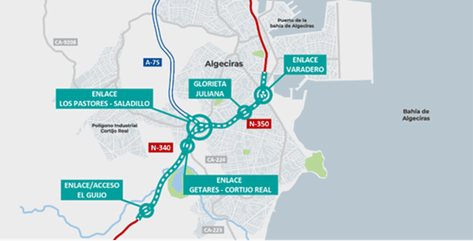 El Ministerio de Transportes y Movilidad Sostenible continúa ejecutando las obras de duplicación de la carretera N-350 y de acceso sur al puerto Bahía de Algeciras, que incluyen las carreteras N-350, N-340 y A-7 en la provincia de Cádiz. El proyecto cuenta con un presupuesto vigente de 50,312 millones de euros, IVA incluido, financiado con fondos europeos.