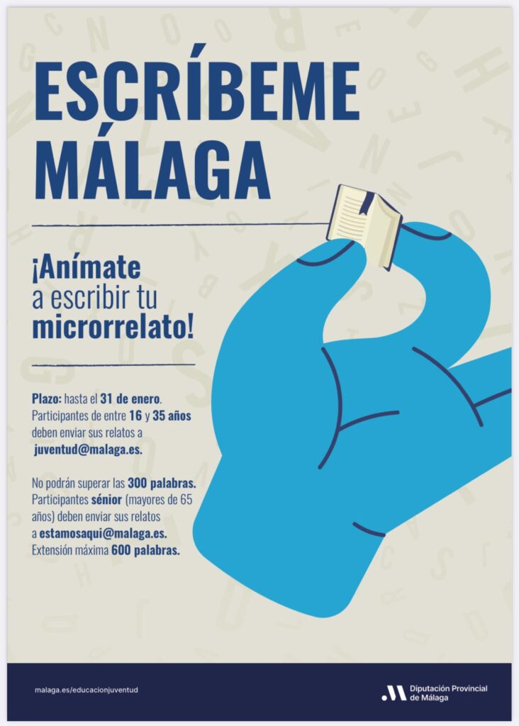 La Diputación de Málaga mantiene abierto hasta el 31 de enero de 2025 el plazo de presentación de textos para la tercera edición del certamen de microrrelatos ‘Escríbeme Málaga’, que por primera vez incluye una categoría para mayores de 65 años, además de la juvenil para participantes de 14 a 35 años.