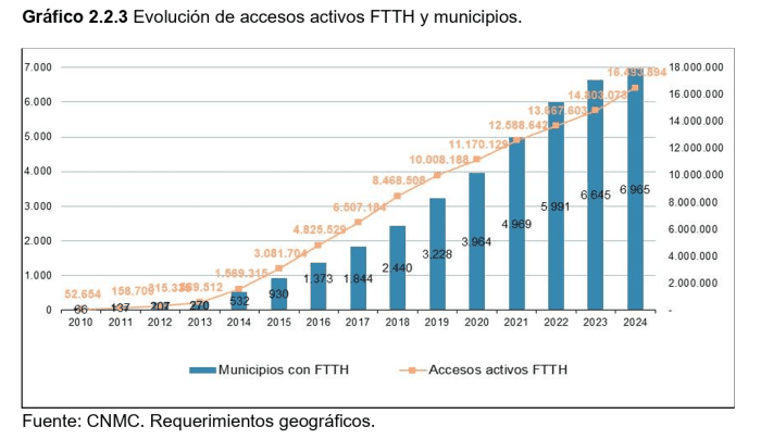 Los accesos de redes de nueva generación (NGA), que incluyen FTTH y HFC, alcanzaron el 96,9% del total de líneas activas de banda ancha fija. Dentro de esta categoría, la FTTH continuó creciendo a doble dígito mientras el HFC registró una reducción. La fibra estuvo presente en 6.965 municipios, que abarcaron el 99,7% de la población española.