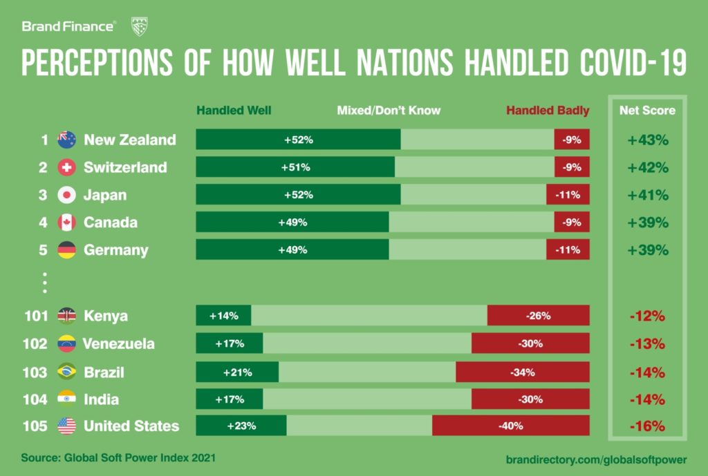 En el otro extremo de la tabla, ocupando el último lugar entre las 105 naciones a nivel mundial incluidas en el estudio, Estados Unidos obtiene un lamentable -16% de puntuación neta. Estos datos se contraponen a la fortaleza que Estados Unidos obtuvo en otras métricas de la encuesta Global Soft Power Index 2020 el año pasado. La respuesta del presidente Donald Trump a la pandemia ha causado controversia tanto en el país como en el extranjero, y el presidente se niega repetidamente a reconocer y actuar sobre la gravedad de la situación. Como la nación que posee la mayoría de los casos y las muertes relacionadas con COVID-19 a nivel mundial, la economía más grande y fuerte del mundo ha enfrentado duras críticas y ha sido cuestionada en el escenario internacional.