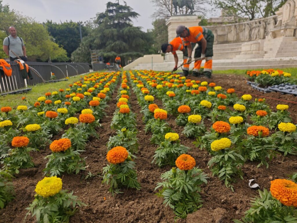 Para esta plantación de primavera se han incorporado ejemplares de tagete, conocido también como clavel moro, una especie originaria de México y América Central cuya floración abarca desde la primavera hasta las primeras heladas en esta ocasión destacan los colores naranja y amarillos. Su resistencia al sol directo y su escaso requerimiento de mantenimiento la convierten en una opción frecuente y acertada para los jardines de Cádiz.