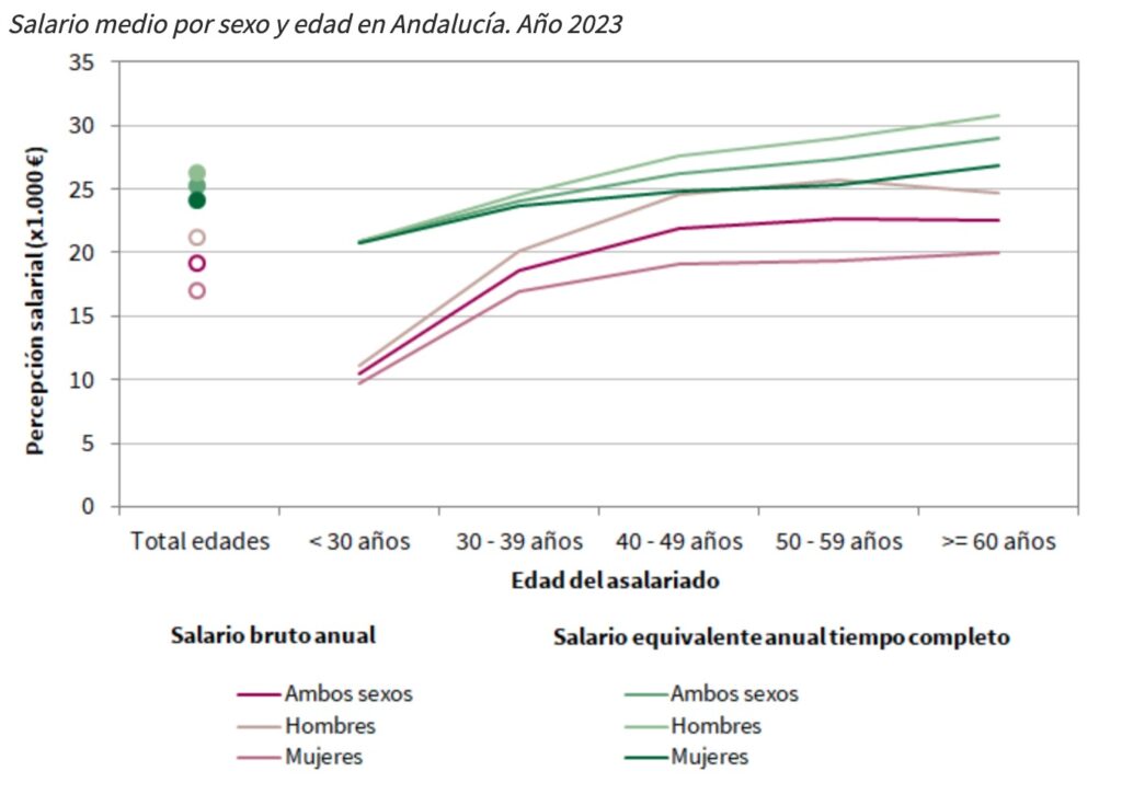 La brecha salarial de género se mantiene significativa: los hombres percibieron 20.192 euros frente a 16.226 de las mujeres, una diferencia del 24,4% que se reduce al 8,8% al considerar el tiempo trabajado. Los mayores de 40 años ingresaron 27.060 euros anuales, mientras los menores recibieron 22.589 euros, aumentando esta diferencia con la edad.
